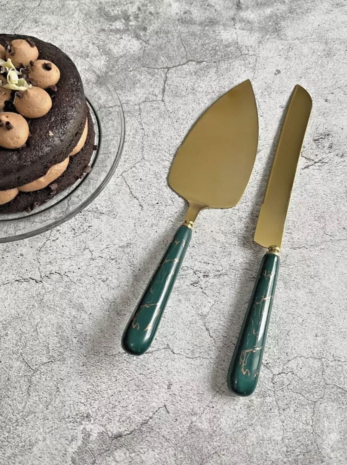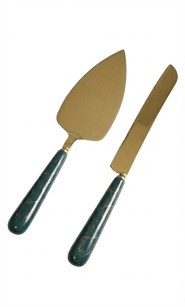 The Gold Cake Serving Set (2-Piece) brings an elegant and luxurious touch to any celebration. Designed with a stunning gold finish and green marble ceramic handles, this set enhances weddings, birthdays, baby showers and other special occasions with timeless sophistication.